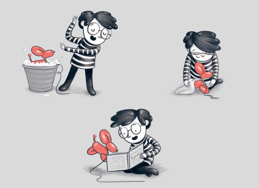The details throughout are fantastic. I love that Spencer chose Pygmalion to read to his dog (it’s so entertainingly appropriate!) and the birthday party is filled with other balloon animals who likewise seem to be animate and running around, even as we see a clown creating them!