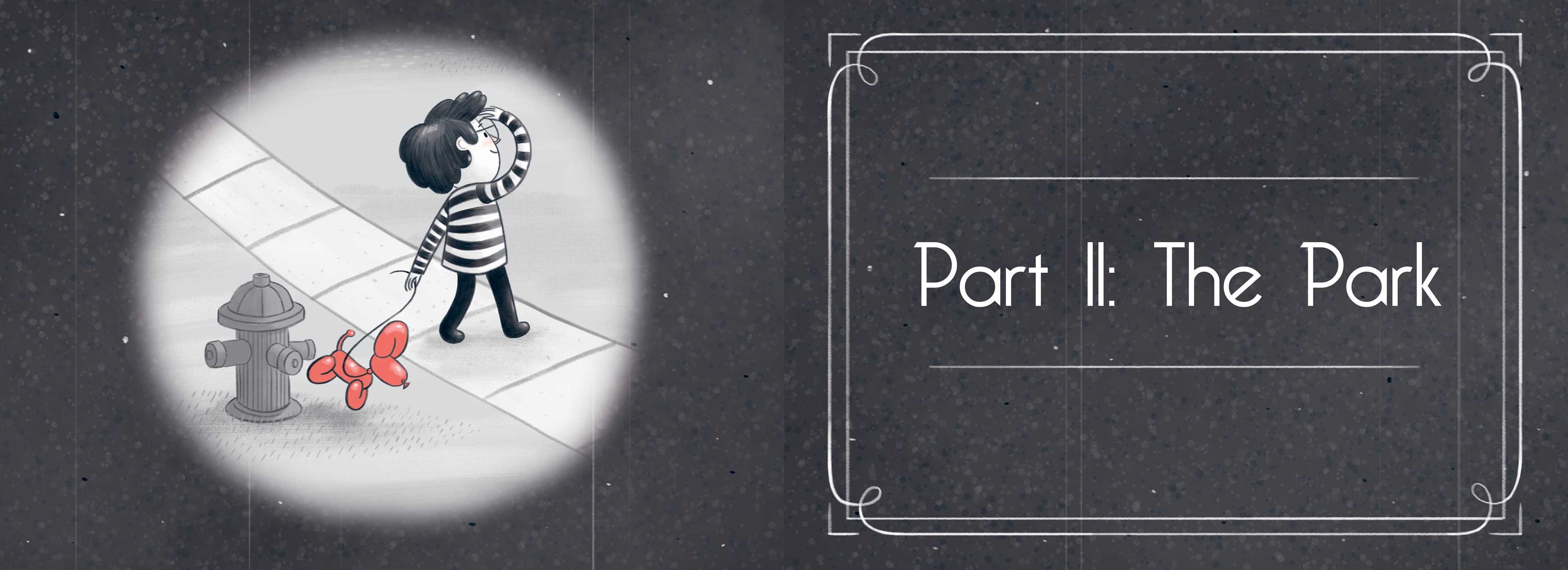 The book is almost entirely wordless (only some title cards at intervals throughout the story really have text) and it is structured like an old silent movie. The story revolves around a boy (Spencer, I assume) and his pet balloon animal that appears to be a red dog.