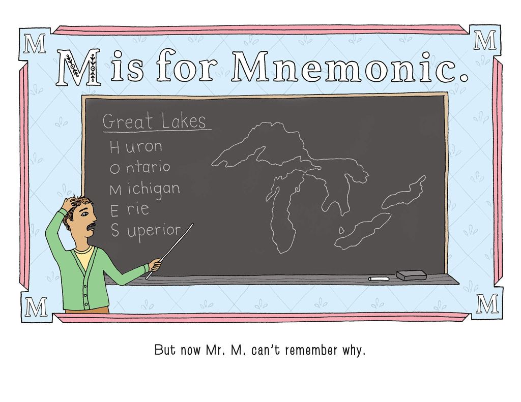 One of my favorite pages in this quirky book is M, which is for the word Mnemonic – a word I never seem able to remember starts with an M (even to the point where I typed it here starting with an N three times before I got it right!). This seems particularly funny for a word that refers to a linguistic memory tool!