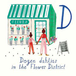 Probably my favorite page was D, which is (somewhat oddly) for the Flower District both because of the fun to say phrase “dozen dahlias” and for the pretty and fun art. The flower shop feels more like Paris to me than New York, but for all I know it’s based on an actual shop in New York City. It’s not a city I know well, so I trust that the artist here knows more than I do!