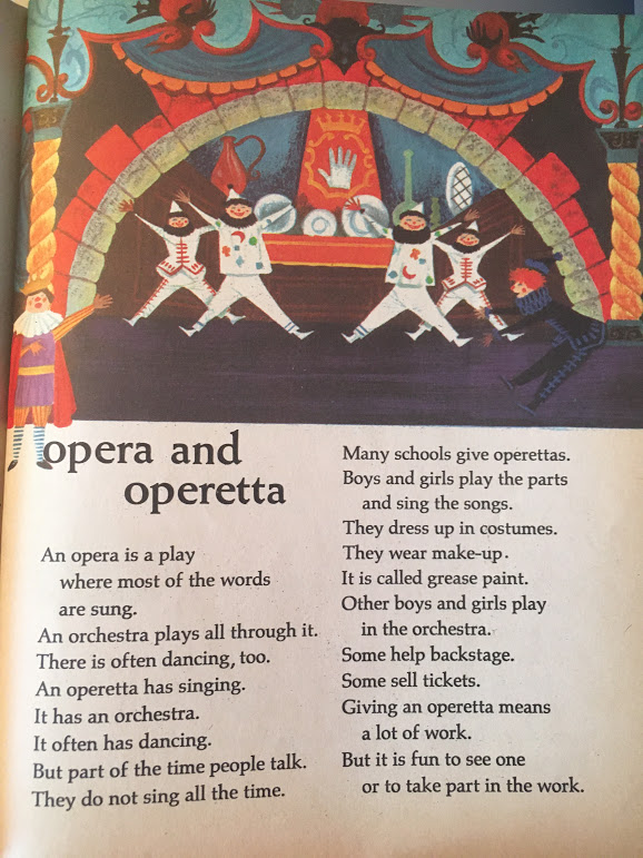 The first one that I want to share is from The Book of N-O by Jane Werner Watson and illustrated by William Dugan. Obviously, this book is one where two letters have to share. One of the poems for the letter O is about opera and operetta and I loved the performing kids in the illustration that goes with it!