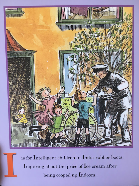 Each letter has a little vignette and a few lines that use the letter as much as possible to tell a very short story. If you look closely at the images, they often have many other things that begin with the letter as well. In this case, it’s a story about Intelligent children celebrating being out after having been cooped up Indoors. I love the details and the expression. And the little one in the doorway still pulling on boots is adorable!